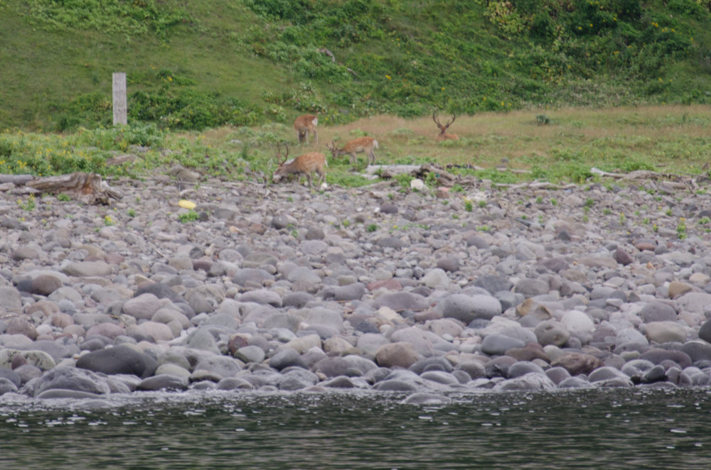 The cruiser approached the bear, which was standing still, quietly observing the river for salmon. It looked like a bear statue. Additionally, on the opposite side from the bear, we spotted other wild animals—Ezo deer, four Hokkaido deer.