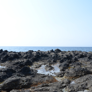If you walk a little to the left from the inn, you’ll find an observatory. From this high vantage point, you can get a panoramic view of the small port village of Shiriuchi. Below the observatory is a large rock formation with a parking lot called Ikarikai Parking Park. From there, you can descend to the sea, where you’ll see a small island called Ikarikai Island just ahead. It looks close enough to swim to, but you must never swim here. The currents are very strong, and even skilled swimmers should avoid swimming.