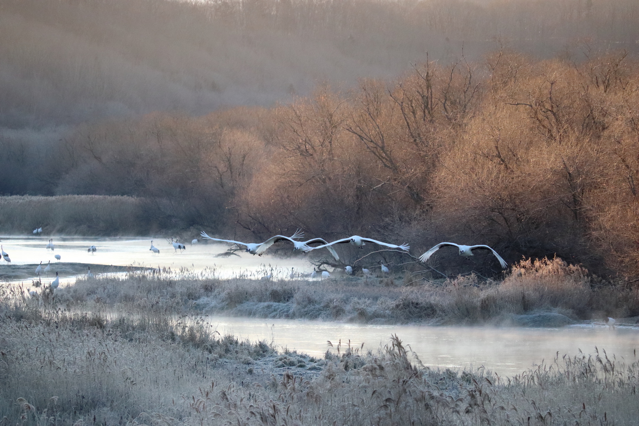 During winter, the red-crowned cranes flock to the river Settsuri (雪裡川) to roost. This mid-river location is crucial for their safety, as it helps protect them from natural predators such as foxes.